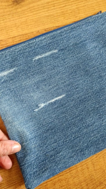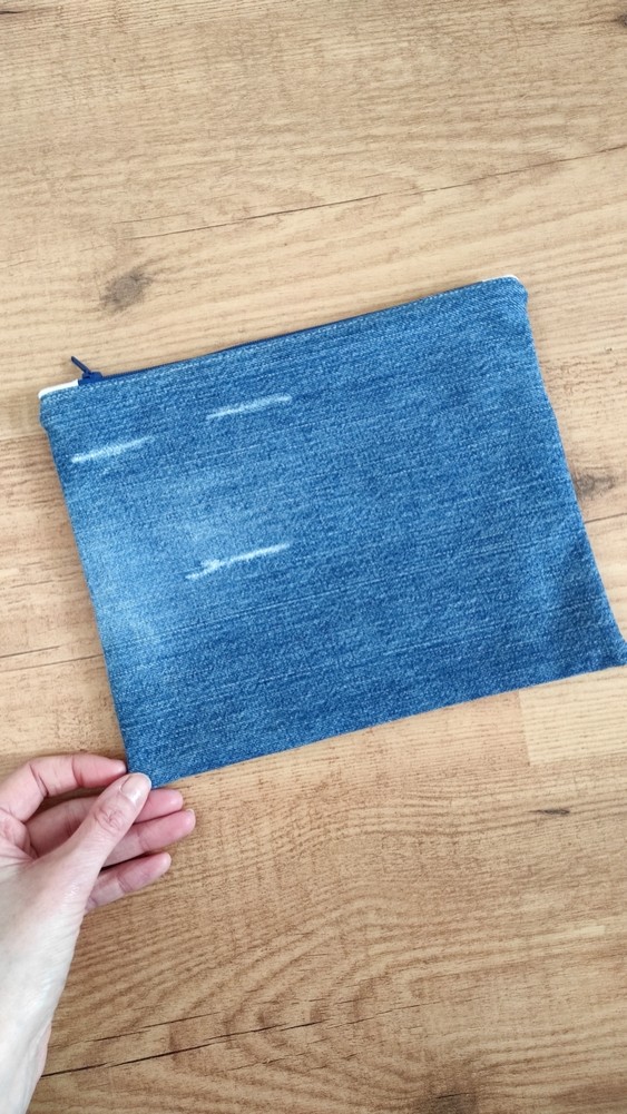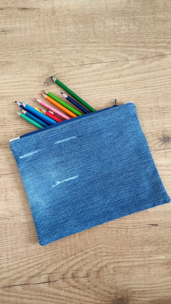 Jolie trousse en jean upcyclé. L'usure du pantalon a été conservé pour donner une touche unique à cette trousse.