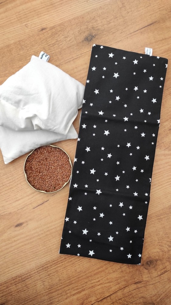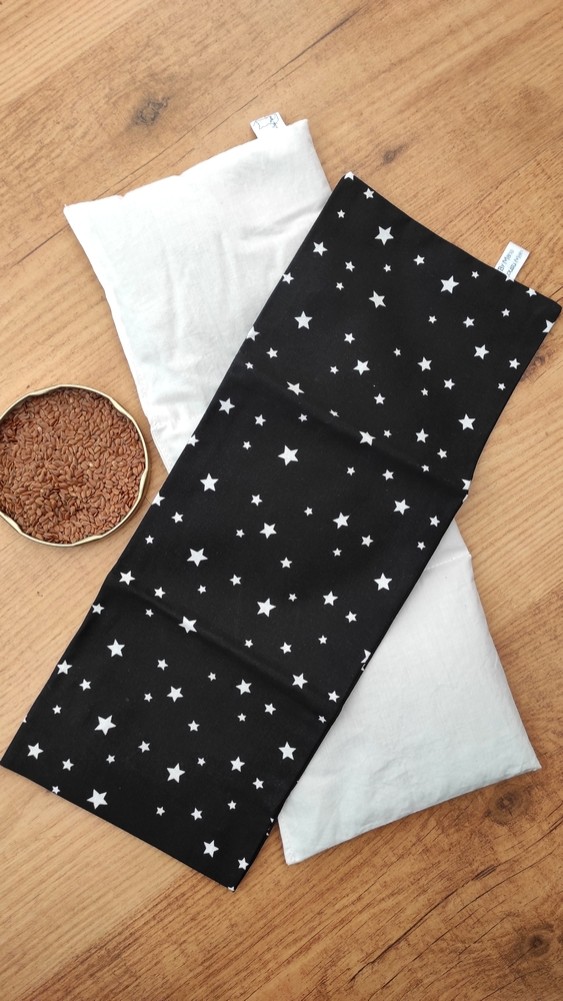 Cousue dans un tissu coton uni et divisée en 3 compartiments garnis de graines de lin bio.