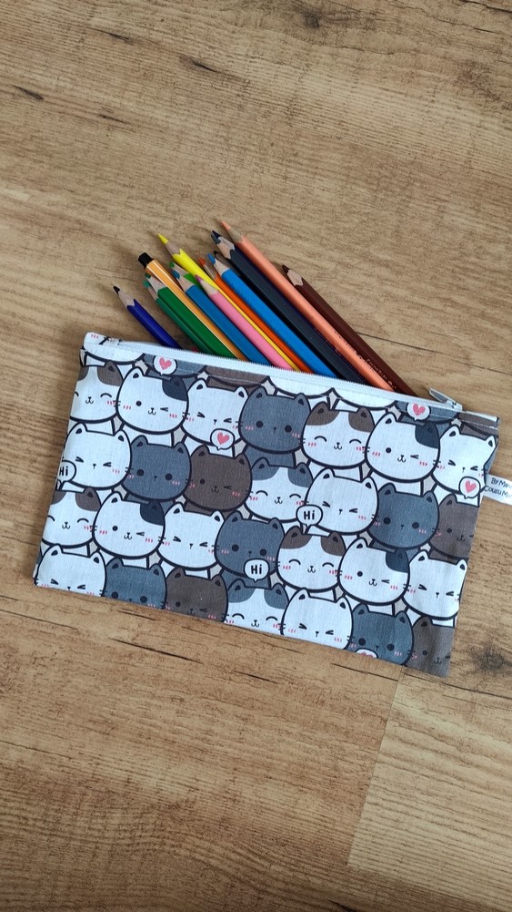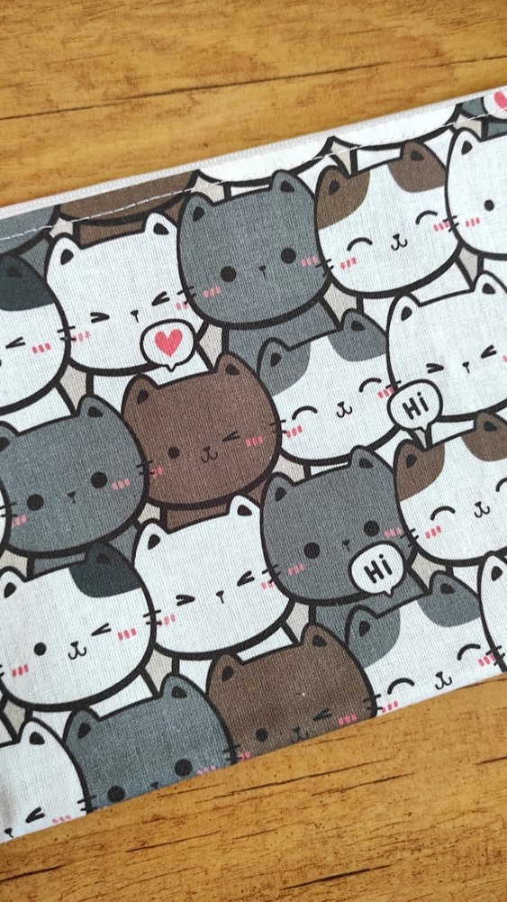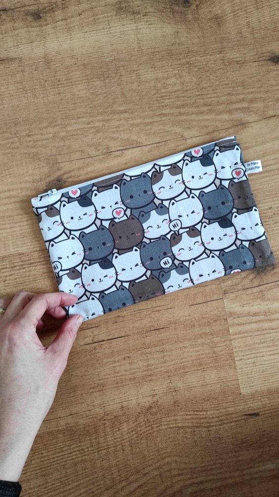 Jolie trousse en tissu coton imprimé chat kawaii, doublure en coton issu d'un ancien drap.