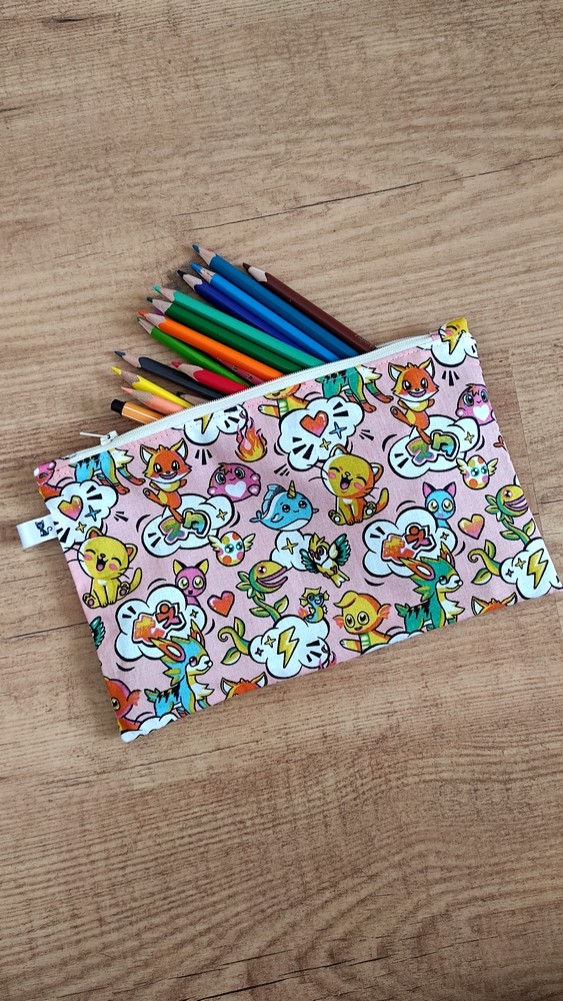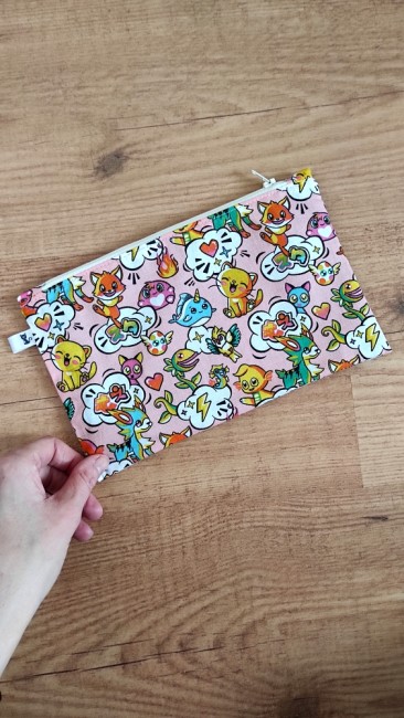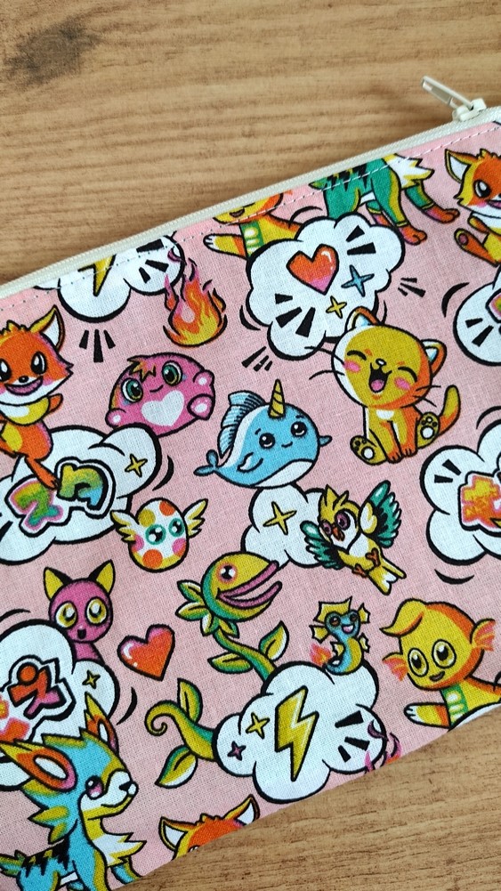 Jolie trousse en tissu coton imprimé inspiration Pokémon, doublure en coton issu d'un ancien drap.