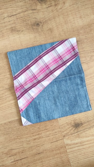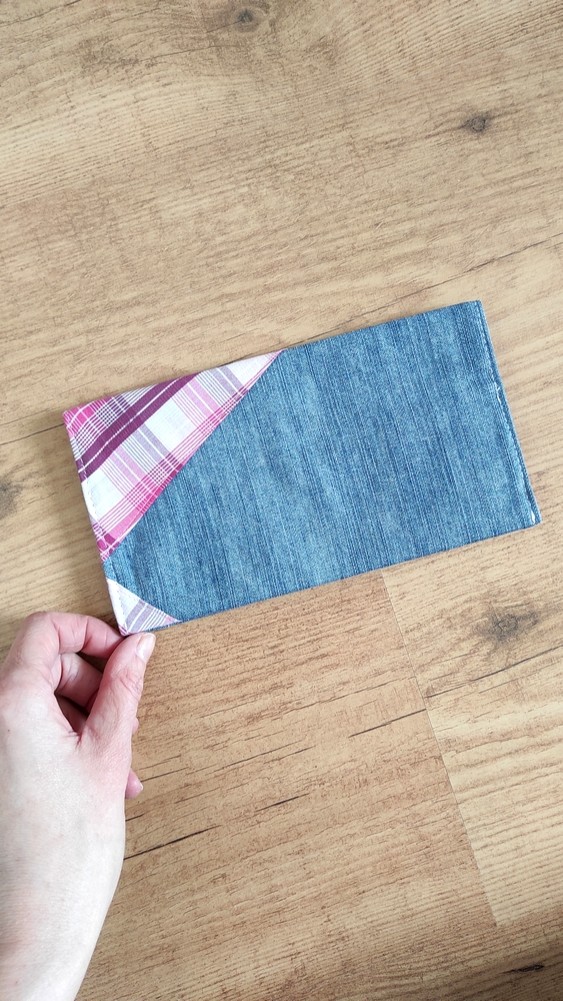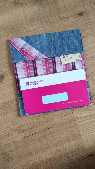 Un porte-chéquier en mode upcycling : du tissu venant d'un ancien jean et d'une vieille chemise à carreaux roses.