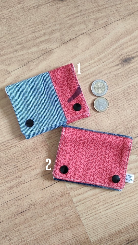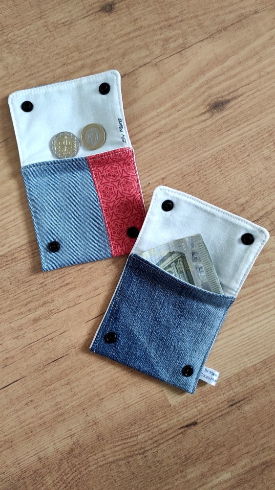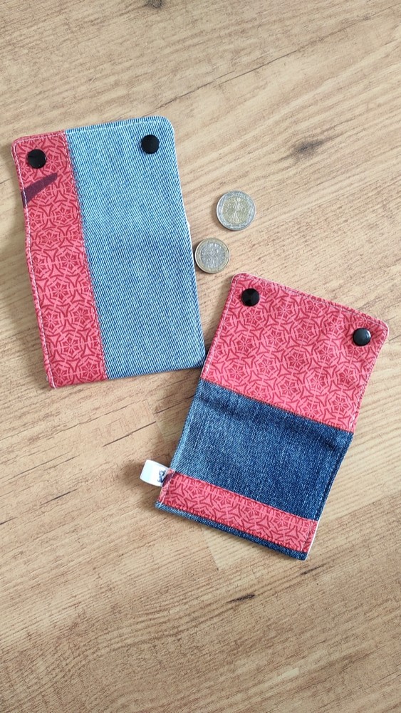 Ce porte-monnaie est fabriqué à partir de tissus récupérés : du jean et des chutes de tissu coton, ce qui en fait une pièce unique de part la disponibilité du coupon de tissu, sa découpe, la teinte du jean.