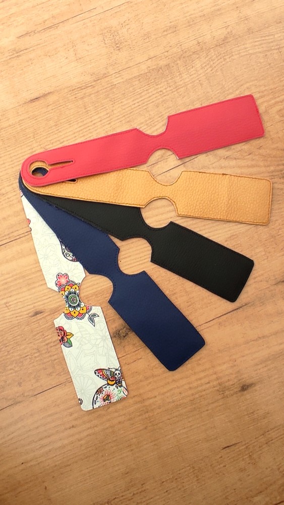 Cousues à la main dans du simili-cuir avec une partie plastifiée pailletée pour y glisser l'étiquette où inscrire vos coordonnées.