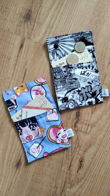 Jolis portes-monnaie rectangulaires cousus dans des tissus imprimés manga.